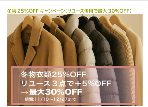 🧥冬物衣類25%OFFキャンペーン開催中!(リユース併用で最大30%OFF)