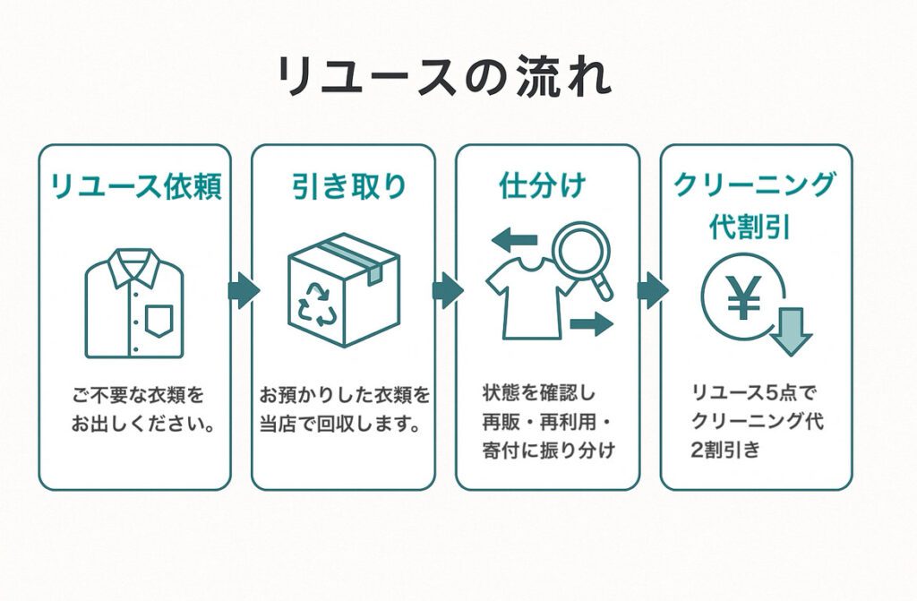 ご不要な衣類を 5点以上 リユースにお出しいただいた場合、その日のクリーニング代、または次回のクリーニング代を 20%割引 いたします。